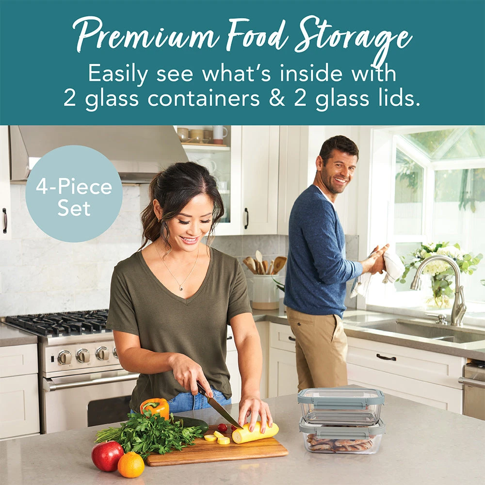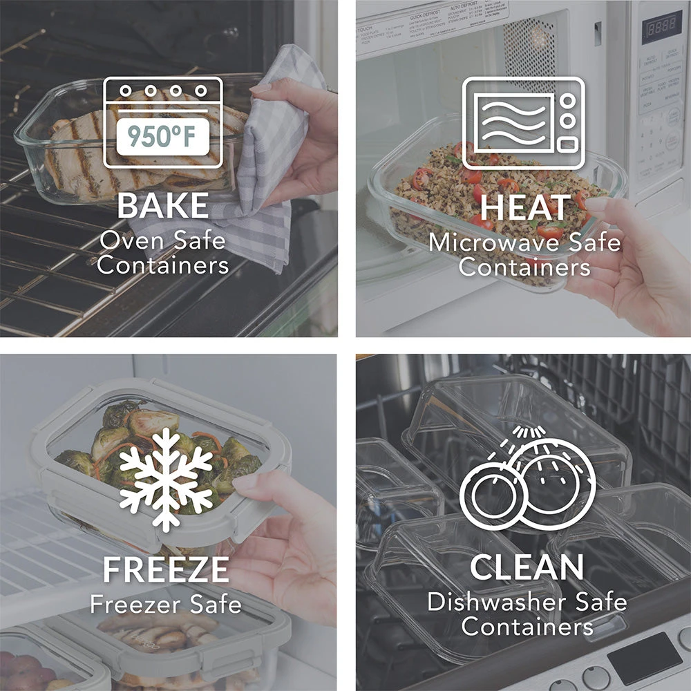 - A HOME ESSENTIAL: This 4-piece set of extra-large glass food storage containers is perfect for new homeowners, cooks, or newlyweds. All containers are microwave, dishwasher, oven, and freezer safe, so you can bake, heat, freeze, and clean with ease! Please note: DO NOT heat lids in the oven or microwave.