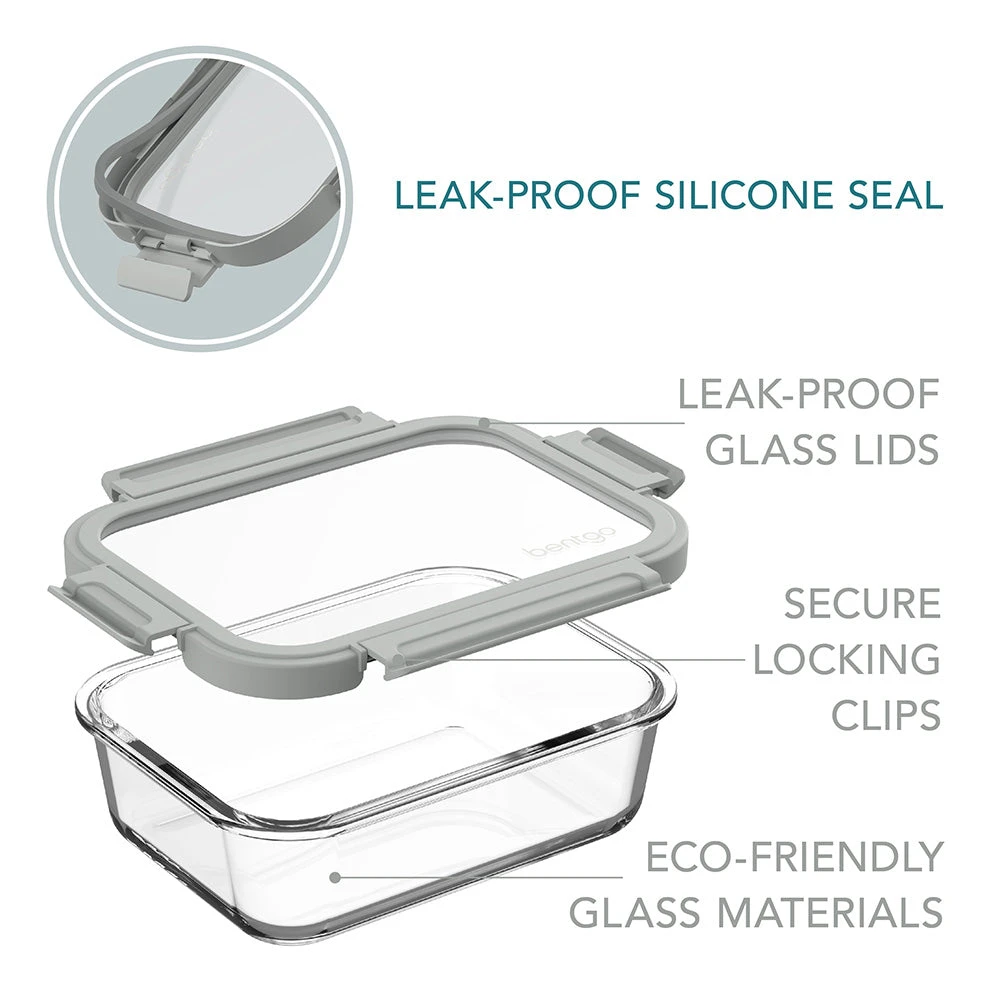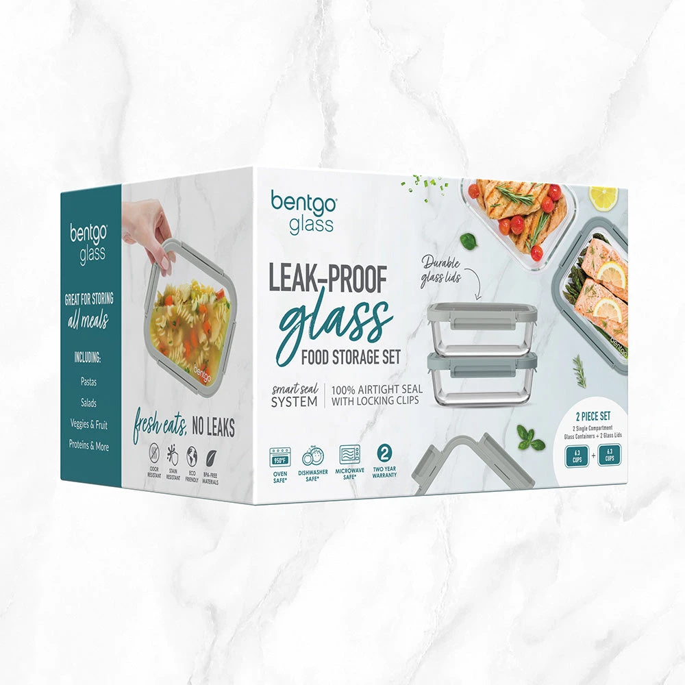 - WHAT YOU GET: Glass food storage containers with lids: 2 extra-large containers and custom-fit lids for each, plus a user manual along with Bentgo’s industry-leading 2-Year Warranty. Our customer support team provides daily quality service and peace of mind to millions worldwide all from a proven brand you can trust.