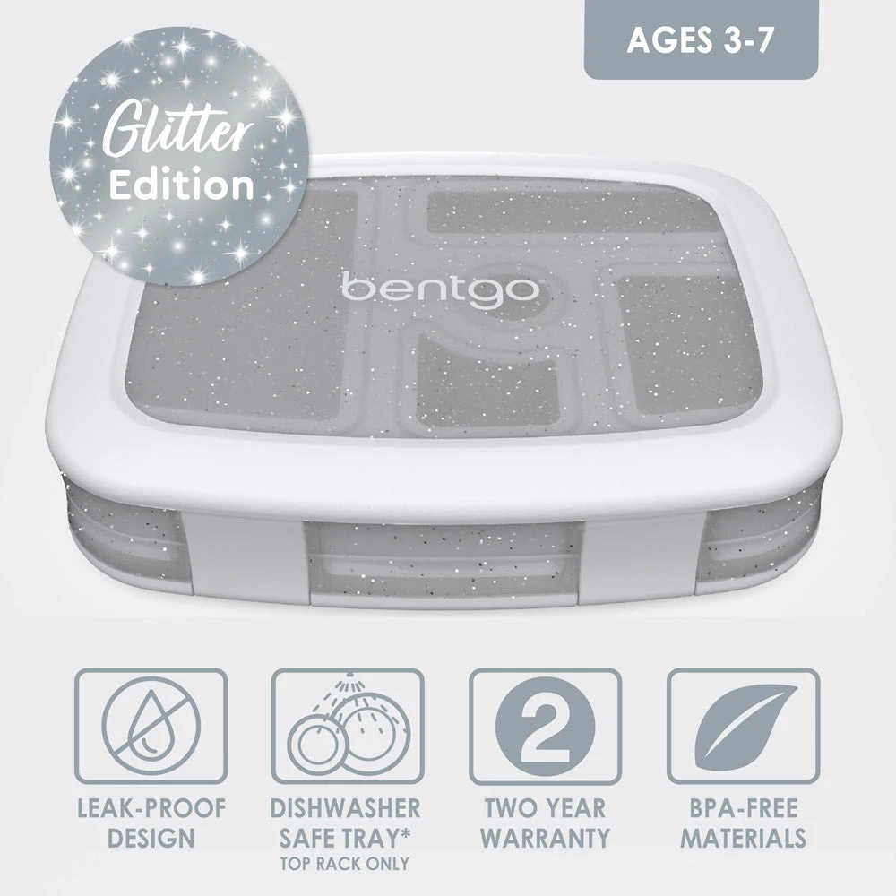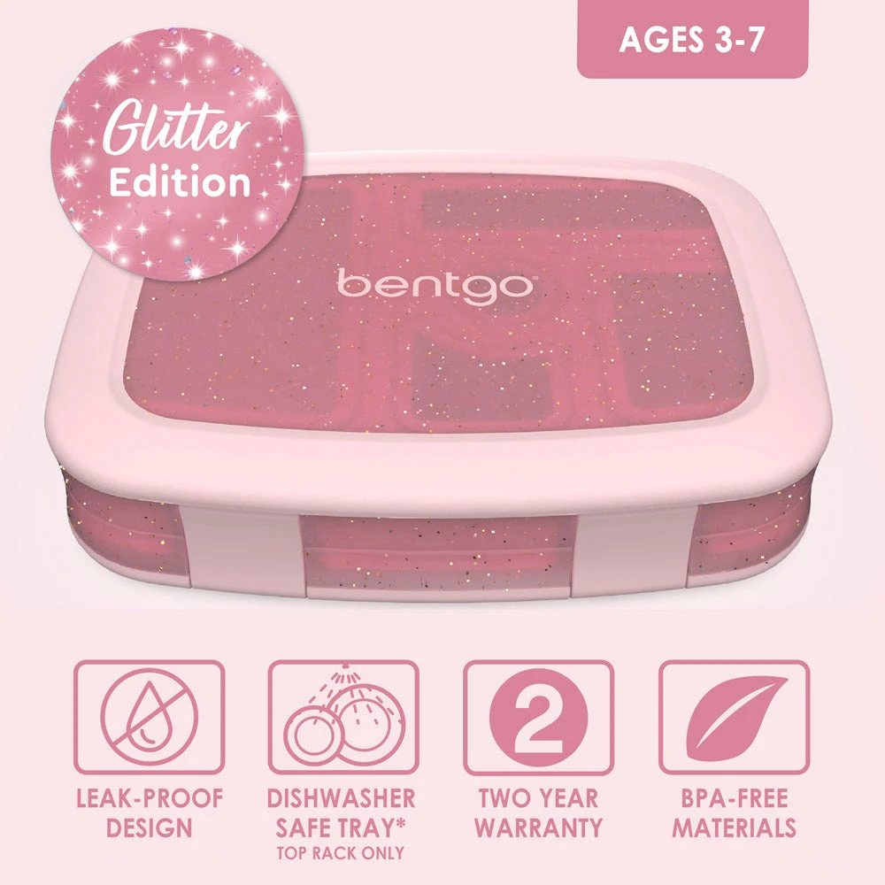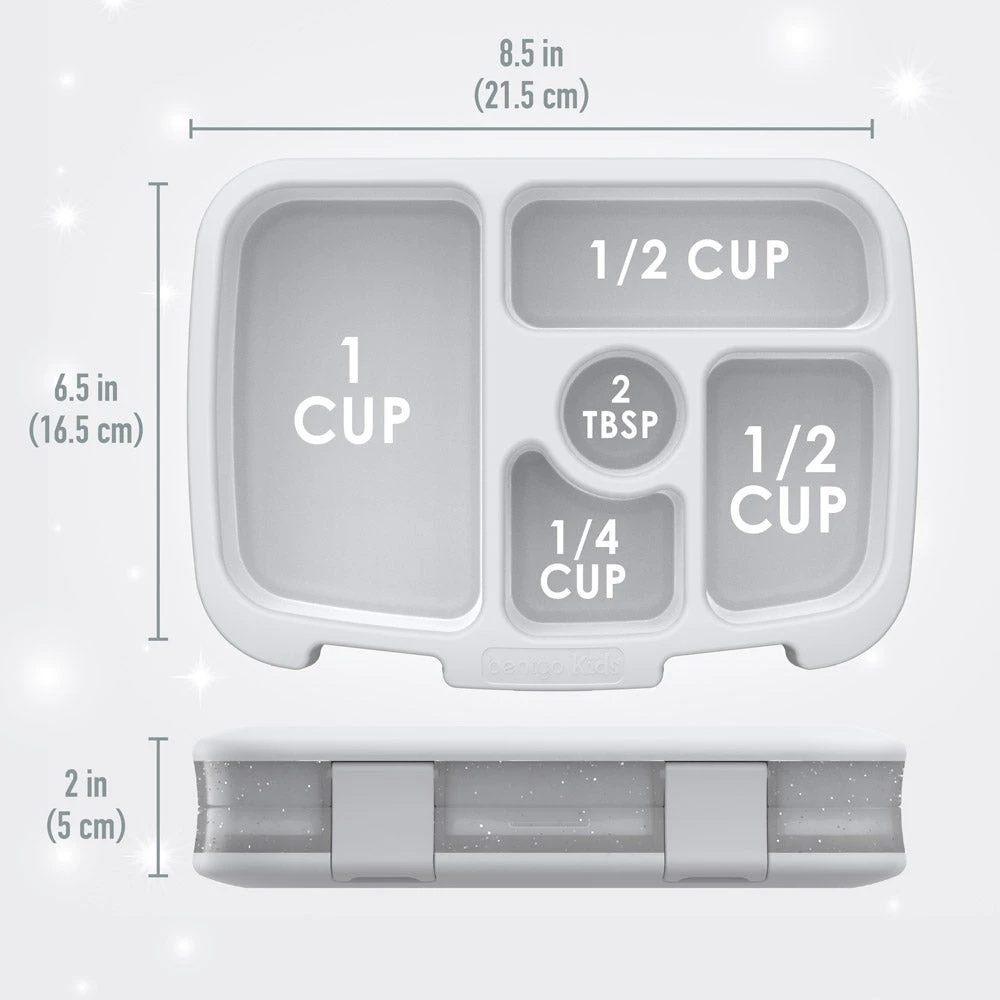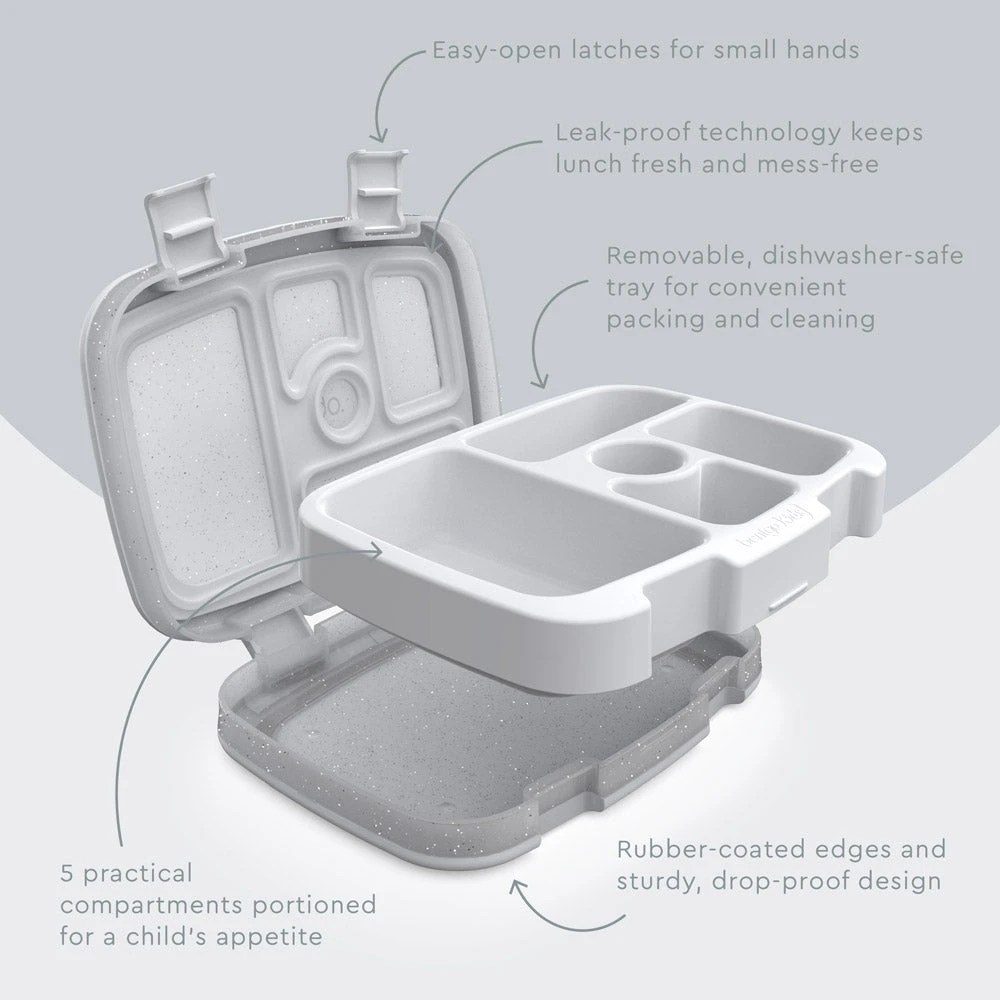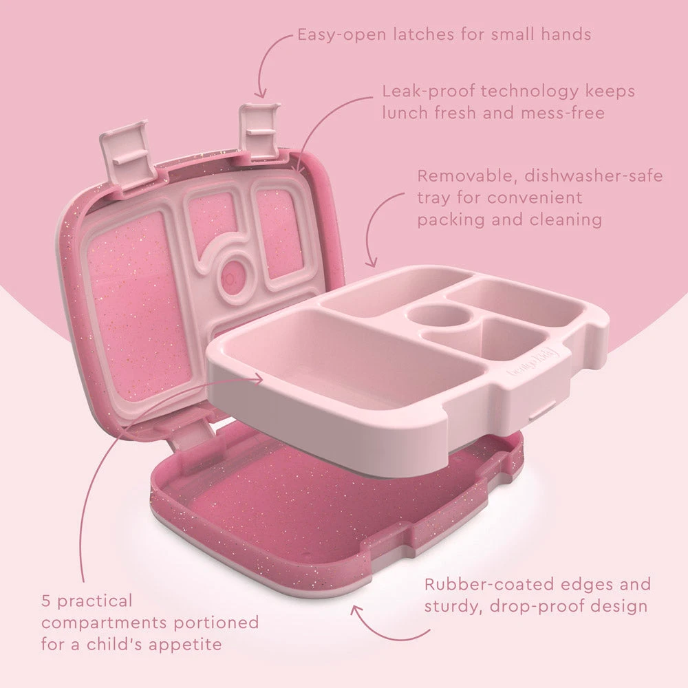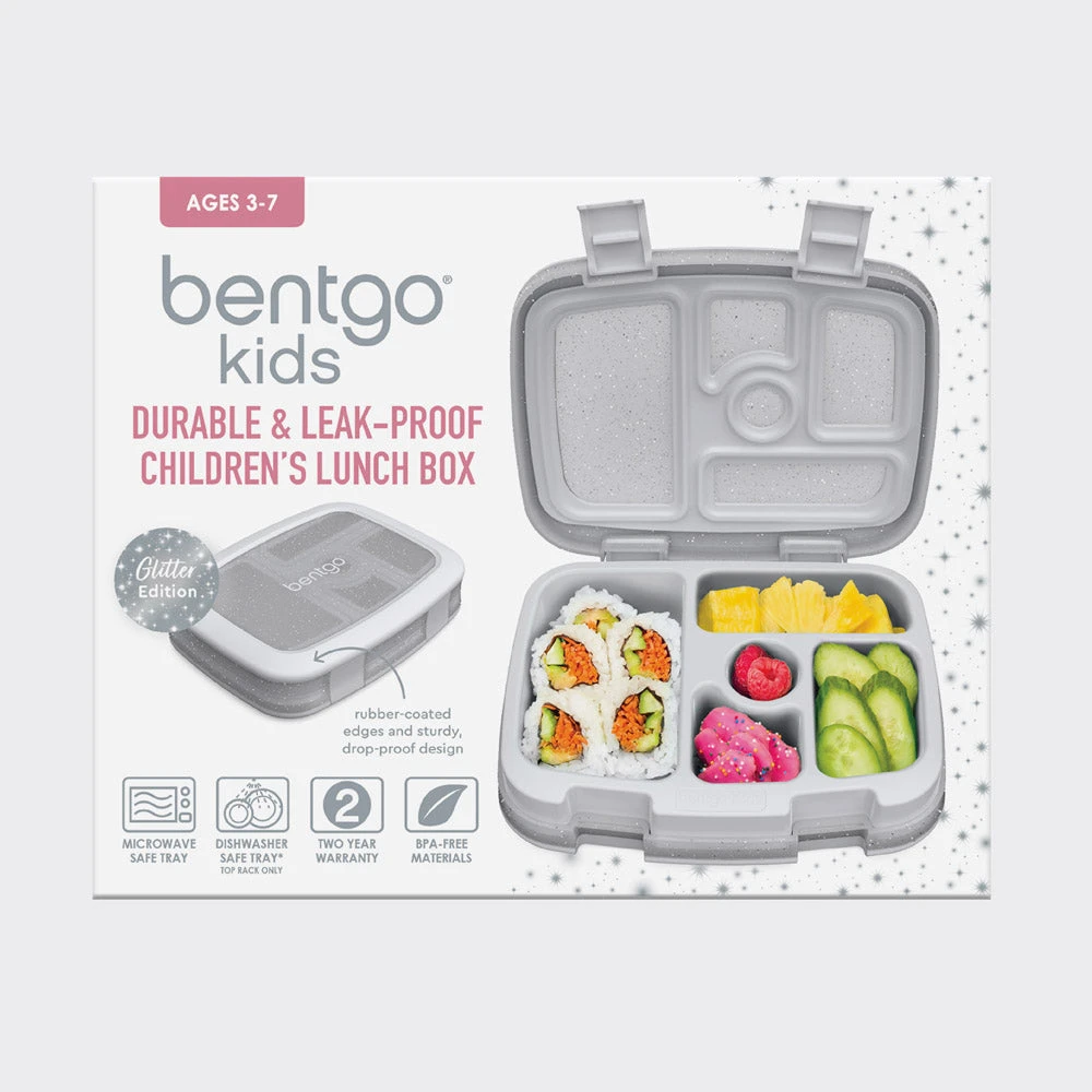 The Bentgo® Kids Glitter Edition and Confetti Edition Lunch Box is an innovative bento-style lunch box with a sparkling touch of glitter, or a colorful splash of confetti. Featuring 5 portion-perfect compartments, it organically inspires parents to pack a more wholesome, balanced lunch for growing kids to take and enjoy at school, the park, and more. Pack everything from a half sandwich or wrap, fruits, and veggies, plus snacks, dip, or dessert. The best part is that this leak-proof lunch box allows you to pack saucy foods like applesauce, yogurt, hummus, and more without the mess! Built to last, it also features 2 kid-friendly latches to keep meals fresh and rubber-coated edges to protect the lunch box when dropped. The removable compartment tray is freezer-safe, microwave-safe, and top-shelf dishwasher-safe, and all components are made with BPA-free, food-safe materials.