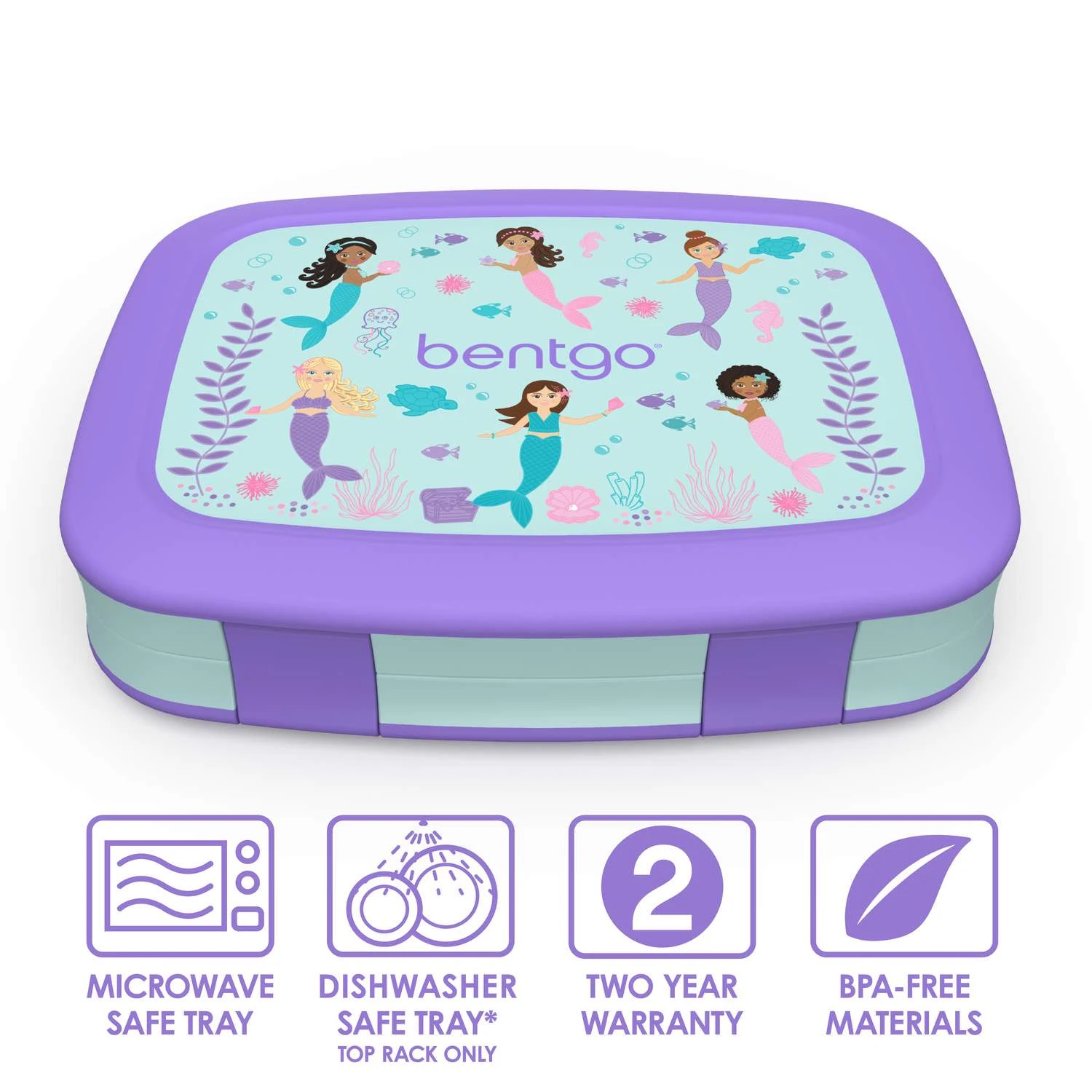 Give your childs lunchbox a fun and stylish makeover with a bold, new pattern from Bentgo Kids. This one-of-a-kind, leak-proof Bentgo Kids lunch box features 5 compartments for fruit, veggies, dip, an entree and dessert. With so many perfectly portioned compartments, this Bentgo box for kids organically inspires parents to pack a more wholesome, balanced lunch for growing kids who are always on the go. This bento lunch box for kids features drop-proof, rubber-coated edges and a sturdy design that is ideal for active kids on the go. It keeps meals and snacks fresh and mess-free during transport and includes 2 kid-friendly latches that are easy for small hands to open and close. Our Bentgo Kids Prints come in 6 adorable designs for the perfect lunch box for girls or boys. Although the Bentgo Kids Prints lunch box is recommended for children ages 3-7, it can be used by teens and adults looking to pack a portion-controlled lunch.The removable tray can be placed in the microwave for up to 3 minutes to reheat foodThe easy-to-clean compartment tray in our kids lunch box is top-shelf dishwasher safeBentgo Kids Prints lunch boxes are made of FDA food-grade materials without BPA, vinyl, lead or PVC