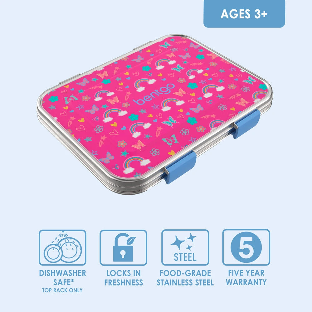 - LEAK-RESISTANT COMPARTMENTS: Pack a variety of foods with confidence knowing our one-of-a-kind lid is contoured to seal each compartment and prevent leaks. We recommend hand washing your Bentgo Kids Stainless Steel Prints lunch box to preserve the leak-resistant seal and keep the secure locking clips firm.