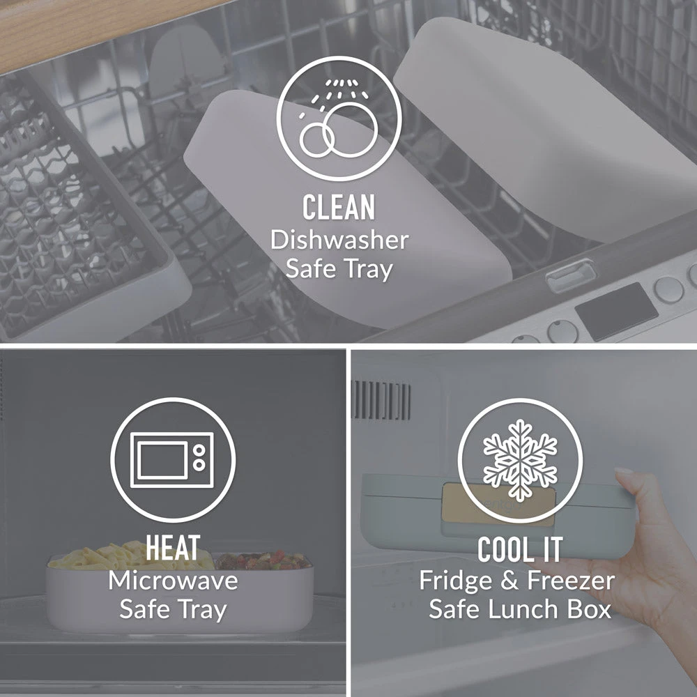 - LEAK-RESISTANT & EXTRA THICK OUTER SHELL: The double-walled tray holder secures each food compartment with its silicone-sealed, leak-resistant lid. When you’re ready to heat up or clean up your food, take out the food tray and use it in the microwave or dishwasher!