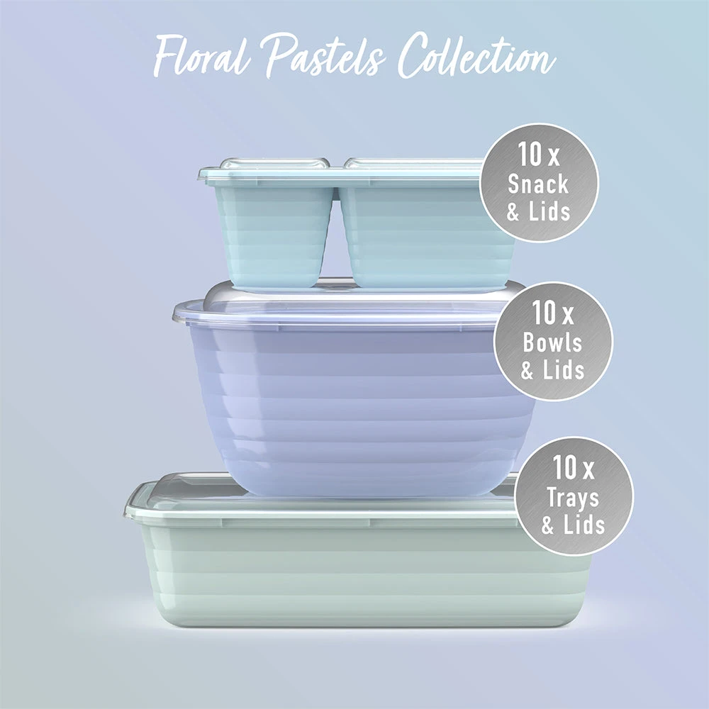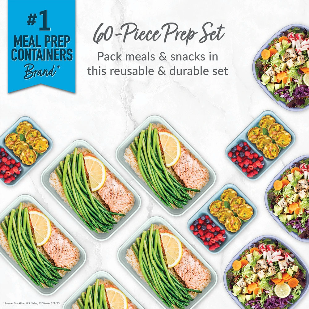 - EVERYONE’S FAVORITE MEAL PREP SET: This variety pack comes with a mix of containers to prep healthy meals for breakfast, lunch, snacks, and dinner. The 60-piece set includes ten 1-compartment trays, ten prep bowls, and ten 2-compartment snack trays, all with their own fitted lids. No need to measure your portions—volume is already embossed on the tray. The custom-fit lids keep food fresh all day long and stack together neatly to save you space in your pantry.