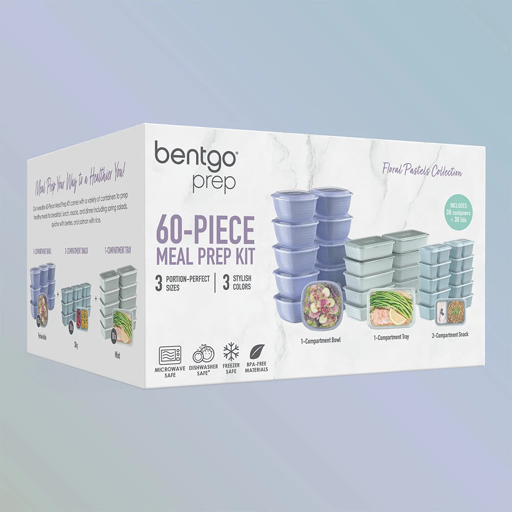 Meal prep the smart, simple way with the Bentgo® 60-Piece Variety Meal Prep Kit. This versatile variety pack features a mix of 1-compartment trays for entrees, spacious prep bowls for salads or rice, and 2-compartment snack trays for midday pick-me-ups, like nuts, berries, and more. Never worry about measuring your food—the volume is embossed right on each tray! The clean, modern design features a ribbed lid that makes it easy to open and close and each meal prep container is safe to pop in the microwave or store in the freezer. Bentgo Prep is made with food-grade materials that contain no BPA, PVC, phthalates, lead, or vinyl. *Source: Stackline, U.S. Sales, 52 Weeks 2/1/23.