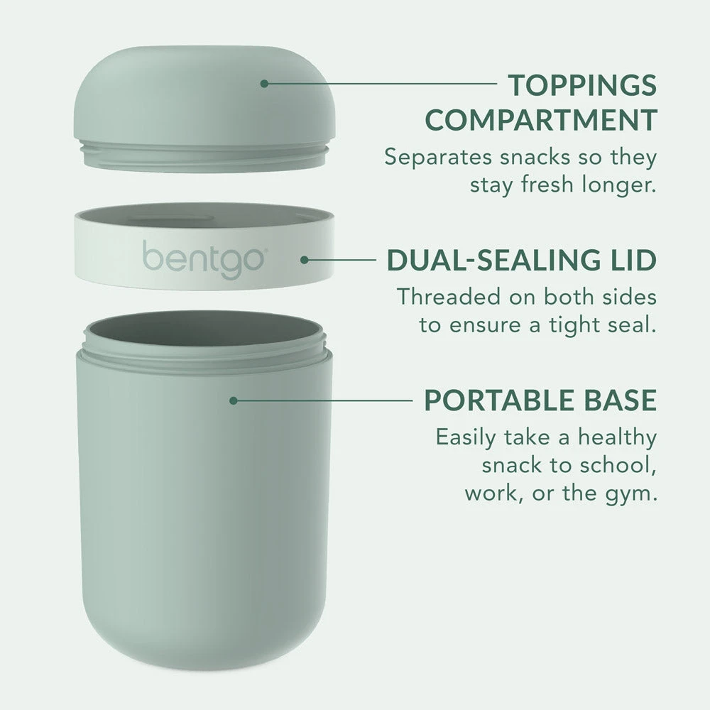 Bentgo® Snack Cup is your sustainable snack solution on the go. The lightweight, leak-proof design with a dual-sealing lid holds a variety of snacks that have separate toppings or dips, like yogurt parfaits or chips and guac.